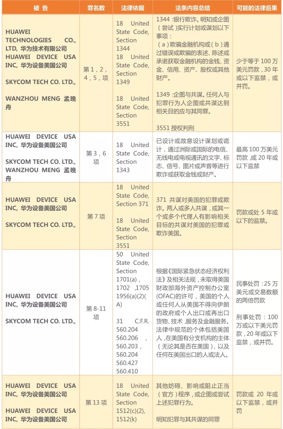華為技術有限公司2007年在香港成立了SKYCOM公司,其主要運營地在伊朗。華為隨后將SKYCOM公司的股份轉讓給另一個華為控制的公司。根據控方的描述,SKYCOM公司使用華為的電郵地址和華為的徽章。SKYCOM雇員根據不同業務使用不同的公司名稱,其在伊朗的領導層是華為的雇員,公司的銀行賬戶也是被華為雇員控制。華為通過SKYCOM公司將美國的貨品或技術出口至伊朗,并通過在美國的四個金融機構進行美元結算。華為中國、SKYCOM與孟晚舟向金融機構及美國政府做出未控股SKYCOM、沒有利用金融機構來處理與伊朗的交易等虛假陳述,隱瞞了華為與SKYCOM的關系及其出口伊朗的事實,從而觸犯了美國的法律。