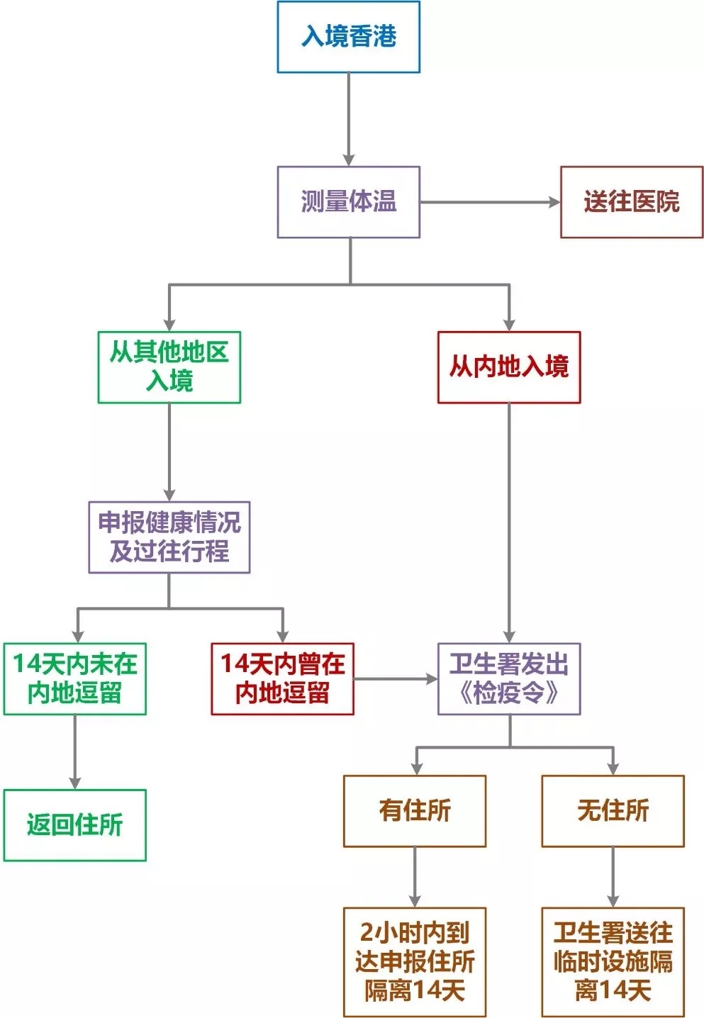 1.對香港居民將進行居家檢疫;對已安排入住酒店或其他住所的非香港居民,將會在有關酒店或住所接受檢疫;若在香港無住所的,則將由衛生署安排至暫住設施接受檢疫。