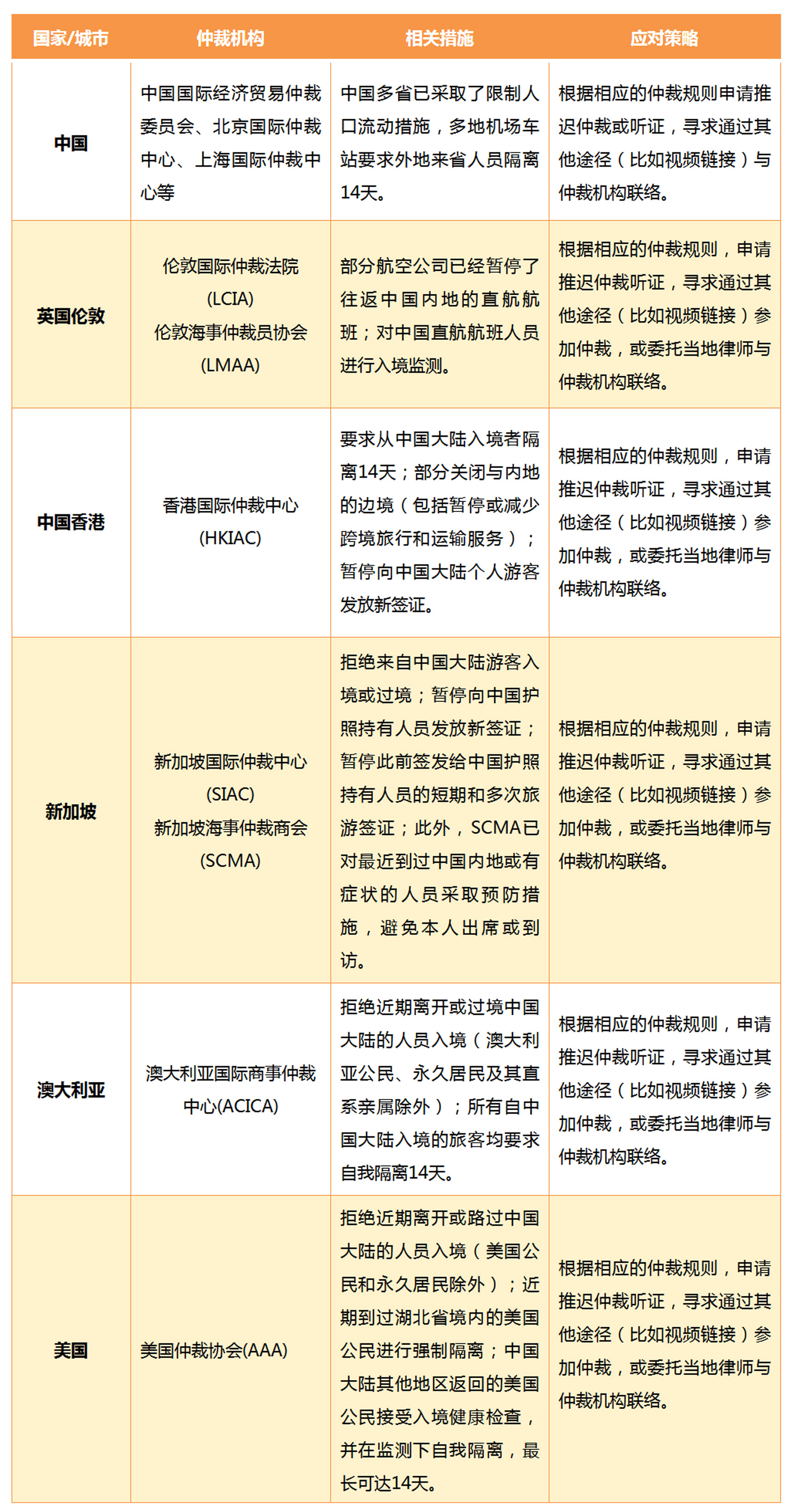 以下是一些主要仲裁庭所在地區(qū)已采取的限制措施和我們建議的應(yīng)對策略:
