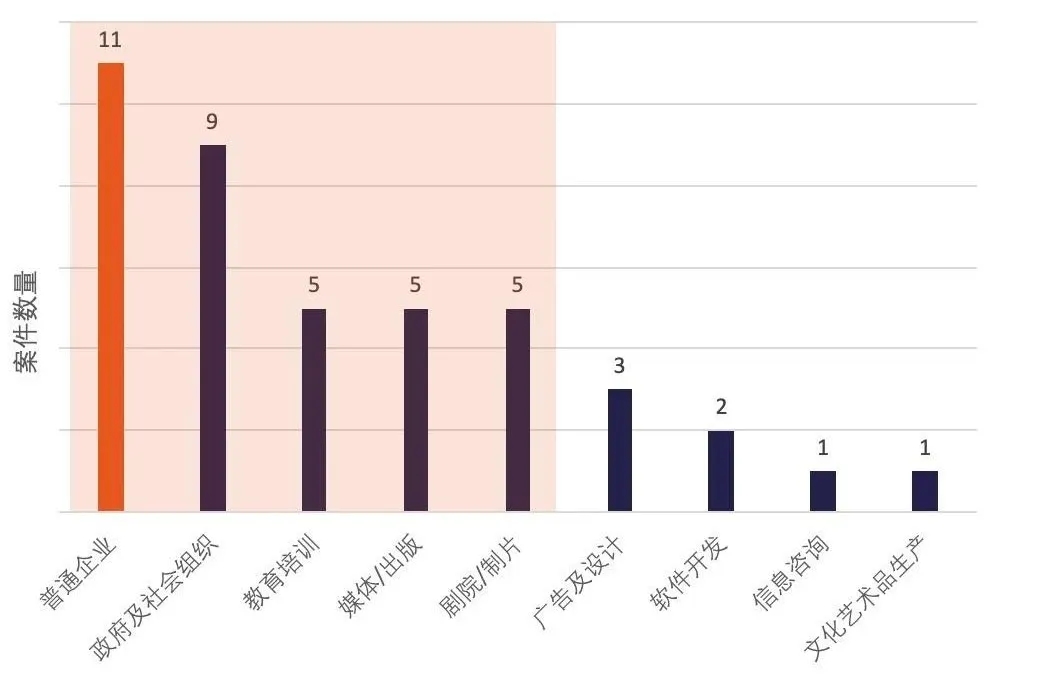 教育培訓機構、媒體出版行業、劇院和制片單位發生的案例也相對較多。但是劇院和制片單位的5例糾紛中,其中3個案件的案涉事實發生年代較早,數據參考性較低。