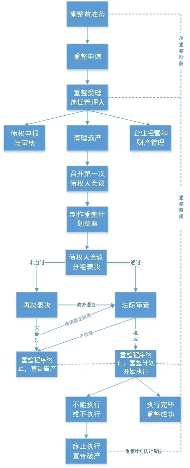 企業重整的基本流程大致可以分為三個階段:重整前的準備階段(或者叫預重整階段)、法院受理后的重整期間以及重整計劃執行階段。具體如下圖: