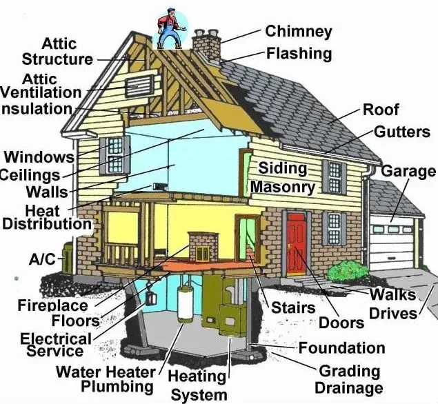 房屋的檢查通常是對房屋的整體結構、地基和土地、屋頂、外部結構、門窗、地下室、爬行區間(建筑物內,尤指地板下面高度不夠人直立行走的空間Crawl space)、供排水系統、供電系統、冷暖設備、浴室、廚房、室內設施、煙囪壁爐和植被樹木等各個方面的檢查。