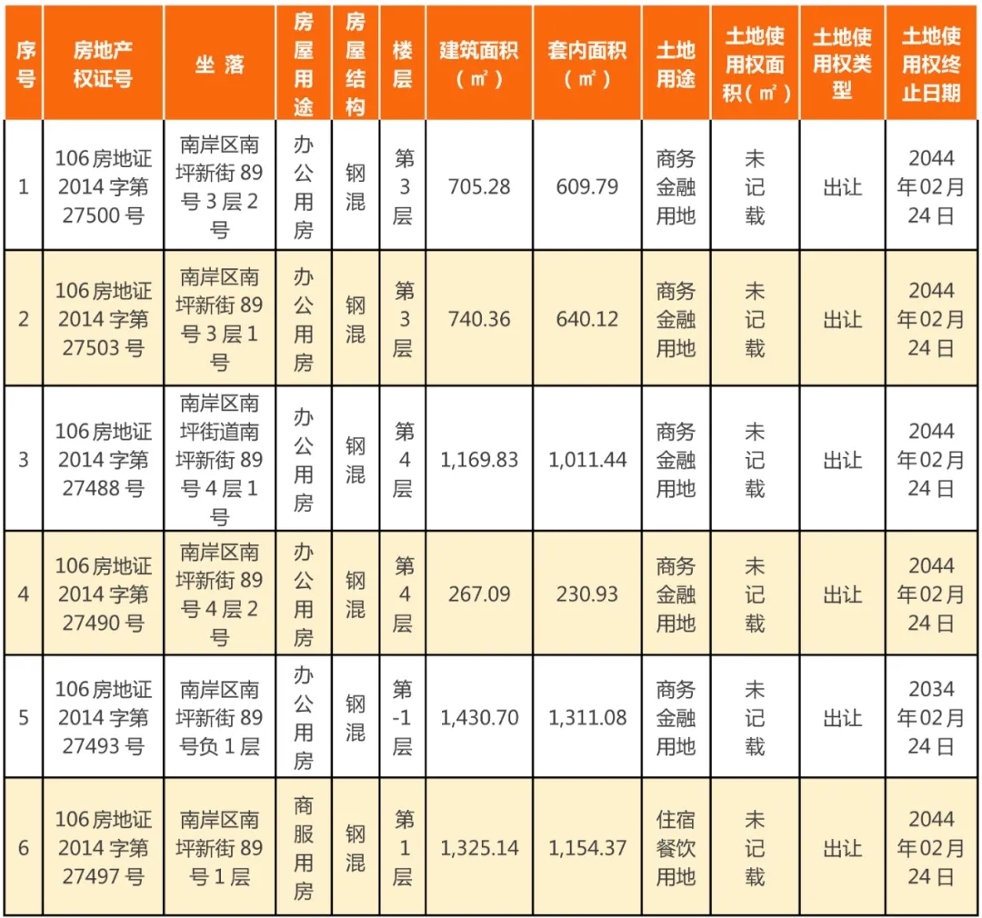 拍賣標的包括六個部分,分別為南岸區南坪新街89號3層2號、南岸區南坪新街89號3層1號、南岸區南坪街道南坪新街89號4層1號、南岸區南坪新街89號4層2號、南岸區南坪新街89號負1層、南岸區南坪新街89號1層。據評估報告顯示(標的詳情見《評估報告》):
