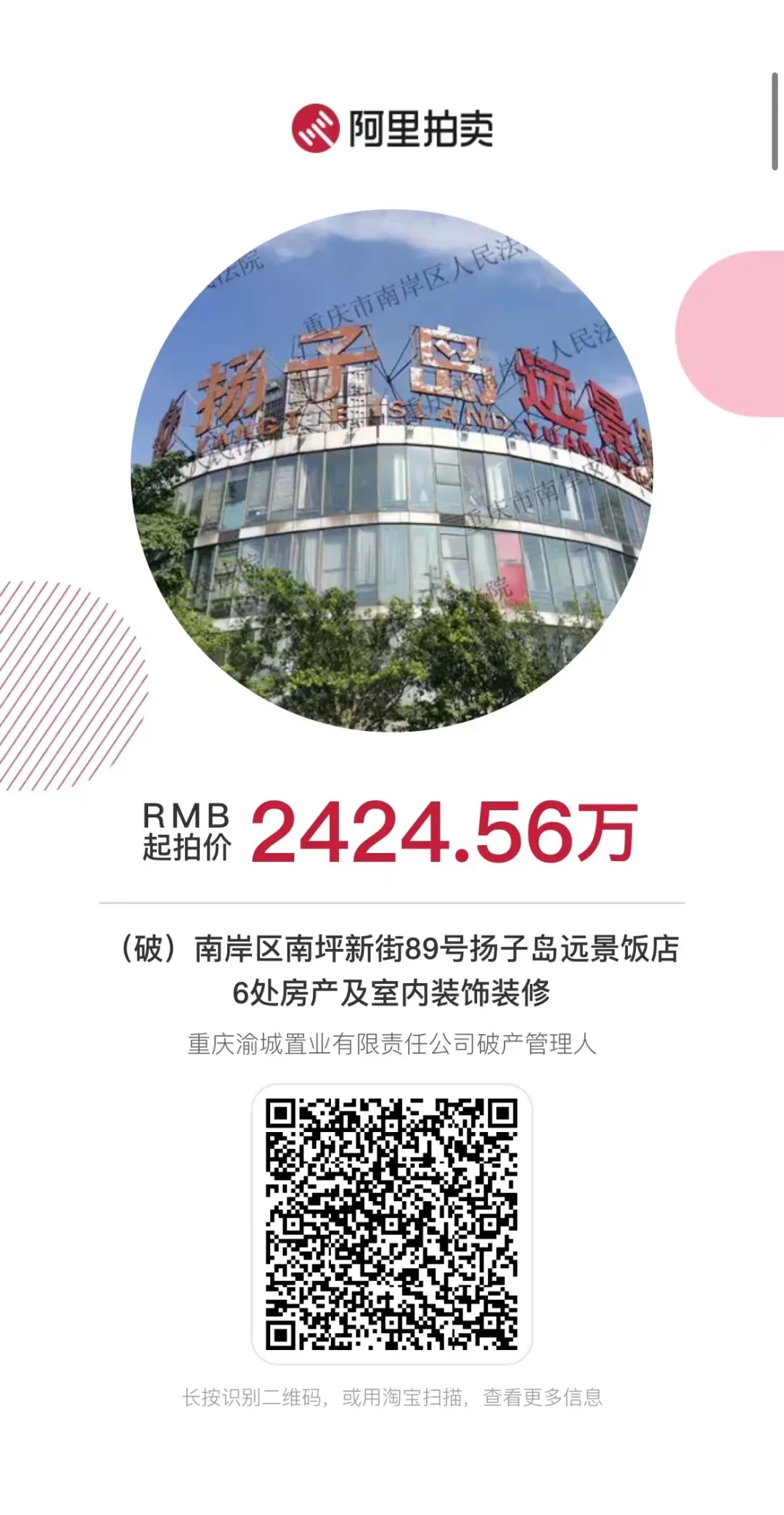 重慶市南岸區人民法院審理的(2016)渝 0108 民破 1號重慶揚子島實業有限責任公司、重慶揚子島訊科餐飲有限公司、重慶揚子島餐飲有限責任公司、重慶渝城置業有限責任公司破產清算案,管理人將于2021年12月8日10時至2021年12月9日10時止(延時除外)在淘寶網阿里拍賣破產強清平臺處置財產。