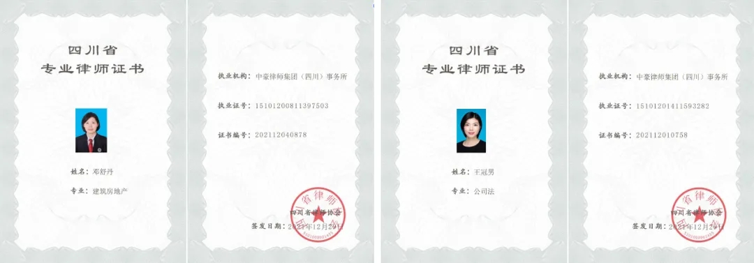 本次四川省共計評定428人次,中豪成都辦公室2名律師分別在公司法、建筑房地產領域通過四川省專業水平評審委員會專業評審。其中,合伙人王冠男被評定為“公司法專業律師”,合伙人鄧舒丹被評定為“建筑房地產專業律師”。