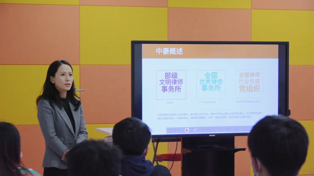 隨后,合伙人柴佳以“律師行業與執業選擇”為主題展開分享,介紹了律師行業的基本情況,以及中豪律師的職業發展路徑和培養計劃,讓同學們更加清晰地了解了中豪在人才引入、培養等方面的機制。柴佳律師結合自身成長經歷,講述了自己在執業過程中遇到的人和事,對同學們的疑惑進行了逐一解答,在執業選擇方面為同學們提出了建議,并在最后為同學們送上美好的祝愿。