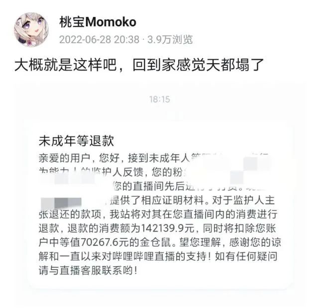 2022年6月28日晚間,嗶哩嗶哩(以下簡稱B站)多名虛擬主播陸續(xù)收到“未成年人退款”的通知,涉及金額從幾毛到十幾萬元不等。其中,虛擬主播“桃寶Momoko”更是接到了退款14萬余元的通知,并針對該事件發(fā)布了視頻及動態(tài)說明: