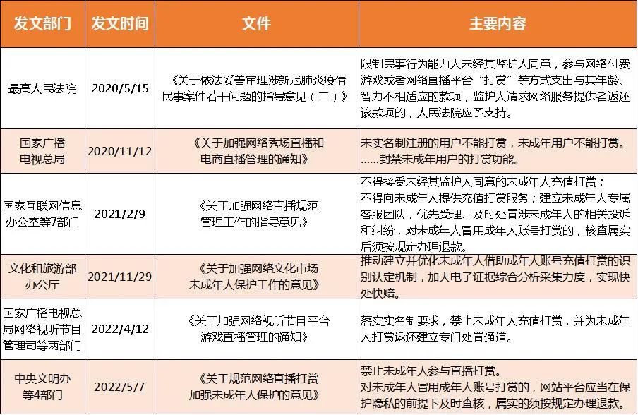 在上述原則的基礎(chǔ)上,相關(guān)部門亦陸續(xù)出臺了針對未成年人直播打賞效力認(rèn)定及退款問題的文件,出臺時間、部門及主要規(guī)定如下: