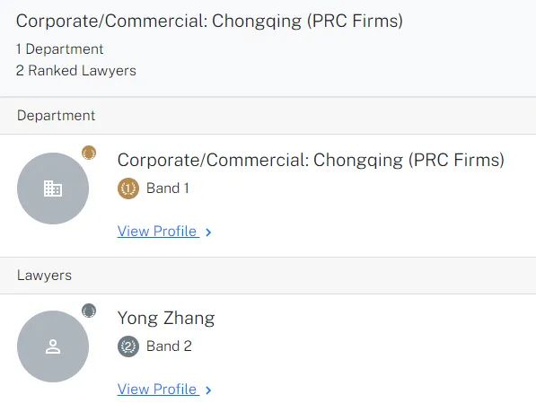 2023年1月14日,全球著名法律評級機構(gòu)錢伯斯(Chambers and Partners)發(fā)布了《錢伯斯大中華區(qū)法律指南》,公布了2023年大中華地區(qū)中資律所影響力排名。資深合伙人、黨委書記張涌被評選為“公司/商事領(lǐng)域 西部(重慶)地區(qū)”領(lǐng)域“第二等領(lǐng)先律師”。