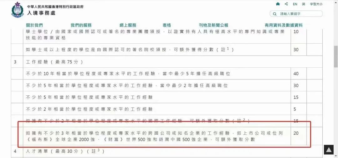 按照最新的計分規則,優才“綜合計分制”下,總分由舊政策的225分,提升為245分。其中,申請人如擁有不少于3年相當于學位程度或專家水平的跨國公司或知名企業的工作經驗,將可以額外加20分。