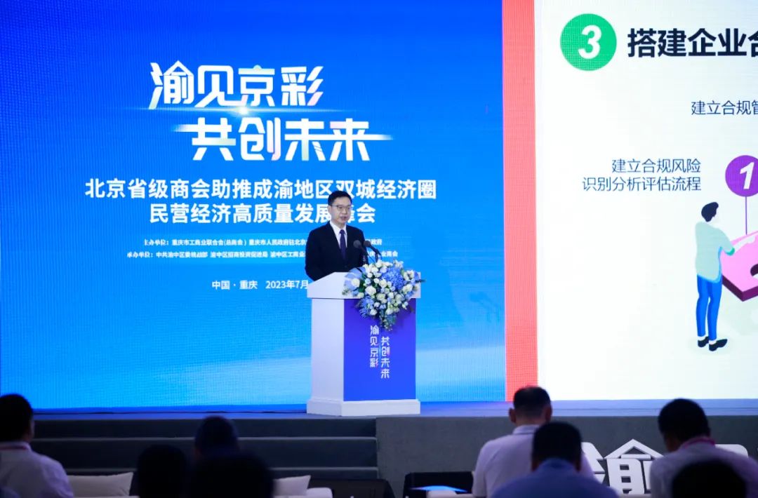 2023年7月6日,由市工商業(yè)聯(lián)合會、市人民政府駐京辦、區(qū)人民政府主辦的“渝見京彩 • 共創(chuàng)未來——北京省級商會助推成渝地區(qū)雙城經濟圈民營經濟高質量發(fā)展峰會”在霧都賓館成功舉辦。市人大常委會副主任趙世慶、市委統(tǒng)戰(zhàn)部常務副部長張洪斌、渝中區(qū)委書記黃茂軍等領導出席會議,在京28家省級商會會長、秘書長,以及來自全國各地的知名企業(yè)代表、投資機構代表等150余人參會。管委會主席袁小彬受邀出席峰會,并發(fā)表“律師在企業(yè)合規(guī)管理構建中的作用”演講。