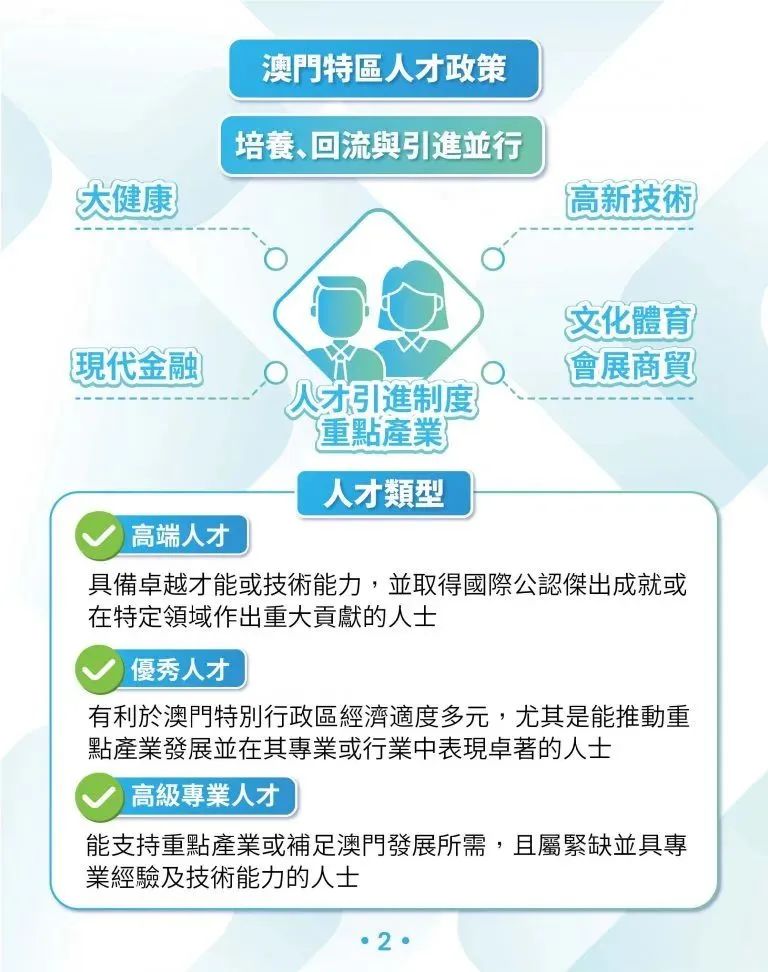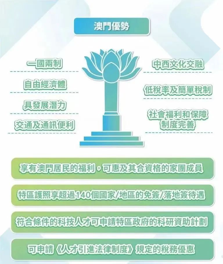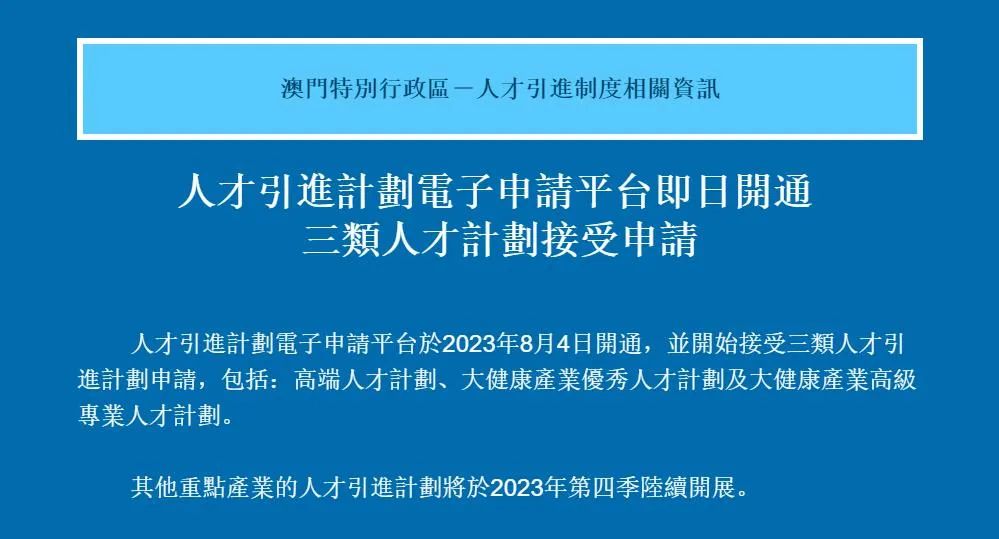 《澳門人才引進(jìn)法律制度》于7月1日生效,該制度圍繞四大重點(diǎn)產(chǎn)業(yè)(大健康、現(xiàn)代金融、高新技術(shù)、文化體育)所需,引進(jìn)高端人才、優(yōu)秀人才和高級(jí)專業(yè)人才三類人才,部分人才不論是否在澳門通常居住,均可申請(qǐng)居留許可續(xù)期。