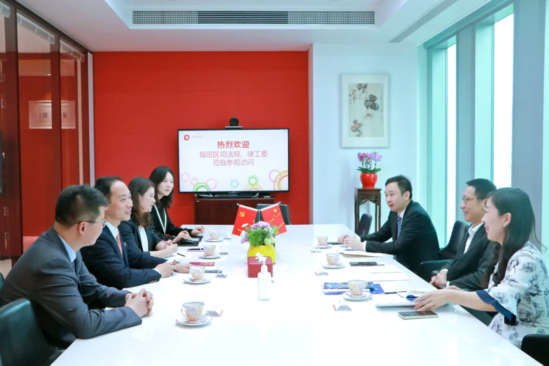 2024年4月29日,深圳市福田區司法局副局長陳冰及福田區律工委秘書長孫春橋一行到訪中豪交流。黨委書記肖東,副書記江小舟、宋琴,合伙人劉卉靈等陪同考察并座談。