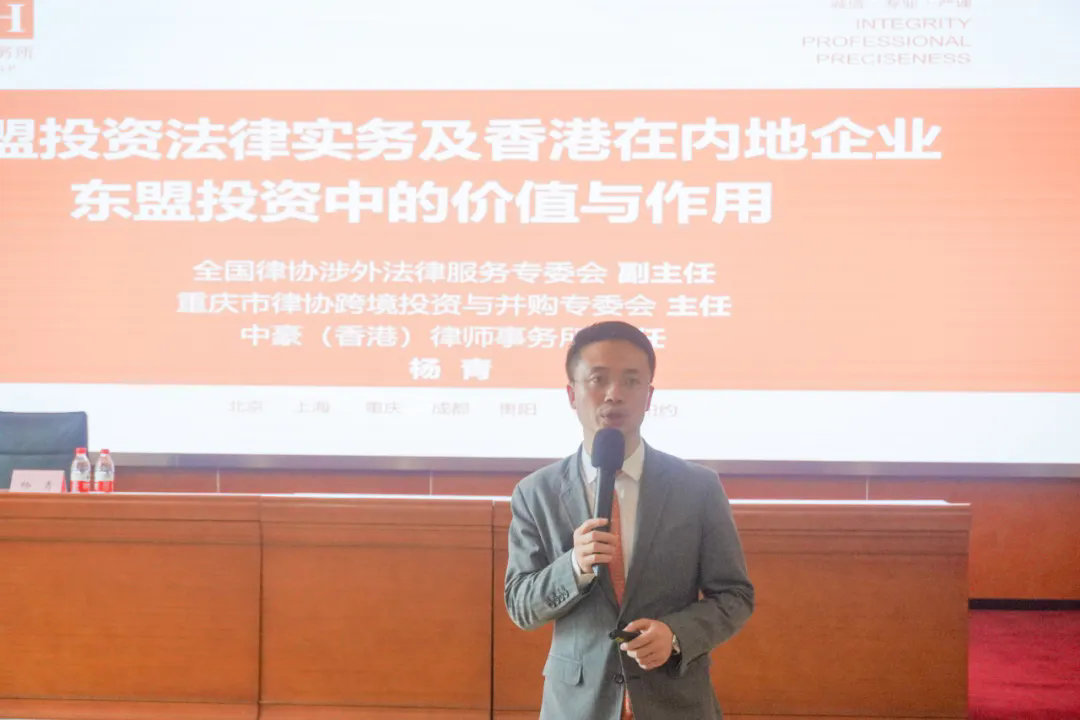 為落實中央關于發展涉外法律服務業的決策部署和市委工作要求,著力提升重慶律師服務企業東盟投資和經貿合作的能力,2024年5月22日-24日,在市司法局的指導下,市律師協會舉辦了“重慶律師行業東盟國別法律實務培訓班”,邀請來自越南、馬來西亞、泰國、老撾等東盟國家的律師、稅務師及企業負責人為50余名重慶涉外律師授課。合伙人兼香港辦公室主任楊青應邀作“東盟投資法律實務及香港在內地企業東盟投資中的價值與作用”主題分享。