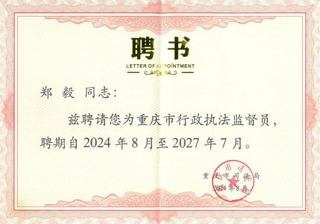 2024年11月14日,市司法局、市工商聯(lián)召開“法治護(hù)企”座談會(huì),舉行了“法治護(hù)企”企業(yè)聯(lián)系點(diǎn)和行政執(zhí)法監(jiān)督員授牌聘任儀式。授牌儀式上,市司法局與市工商聯(lián)向首批10家企業(yè)聯(lián)系點(diǎn)授牌,并為20名行政執(zhí)法監(jiān)督員頒發(fā)聘書。管委會(huì)副主席鄭毅受聘擔(dān)任重慶市行政執(zhí)法監(jiān)督員。