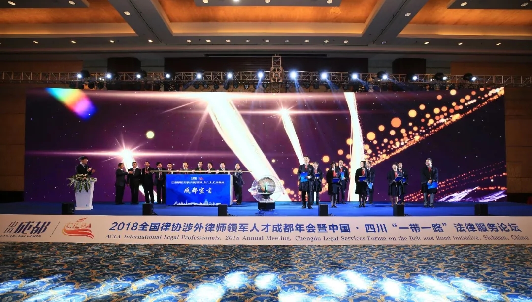 10月27日,由中華全國律師協會主辦,四川省律師協會、成都市律師協會、全國律協外事委員會承辦的“2018全國律協涉外律師領軍人才成都年會暨中國·四川‘一帶一路’法律服務論壇”在成都香格里拉酒店隆重召開,最高人民法院副院長羅東川、四川省高級人民法院院長王樹江、四川省司法廳廳長劉志誠、成都市政府副市長王平江、成都市司法局局長袁宗勇等政府領導出席并致辭和演講。來自全國的涉外律師領軍人才、法律界精英、商界領袖等共400余人參加此次盛會,見證了《“一帶一路”沿線國家法律環境國別報告》《成都宣言》的發布,共商涉外法律服務歷史新機遇。北京辦公室主任章朝暉、重慶辦公室合伙人楊青作為全國涉外律師領軍人才受邀出席,四川辦公室合伙人李靜擔綱論壇主持人,章朝暉作為涉外律師代表為《成都宣言》宣誓。