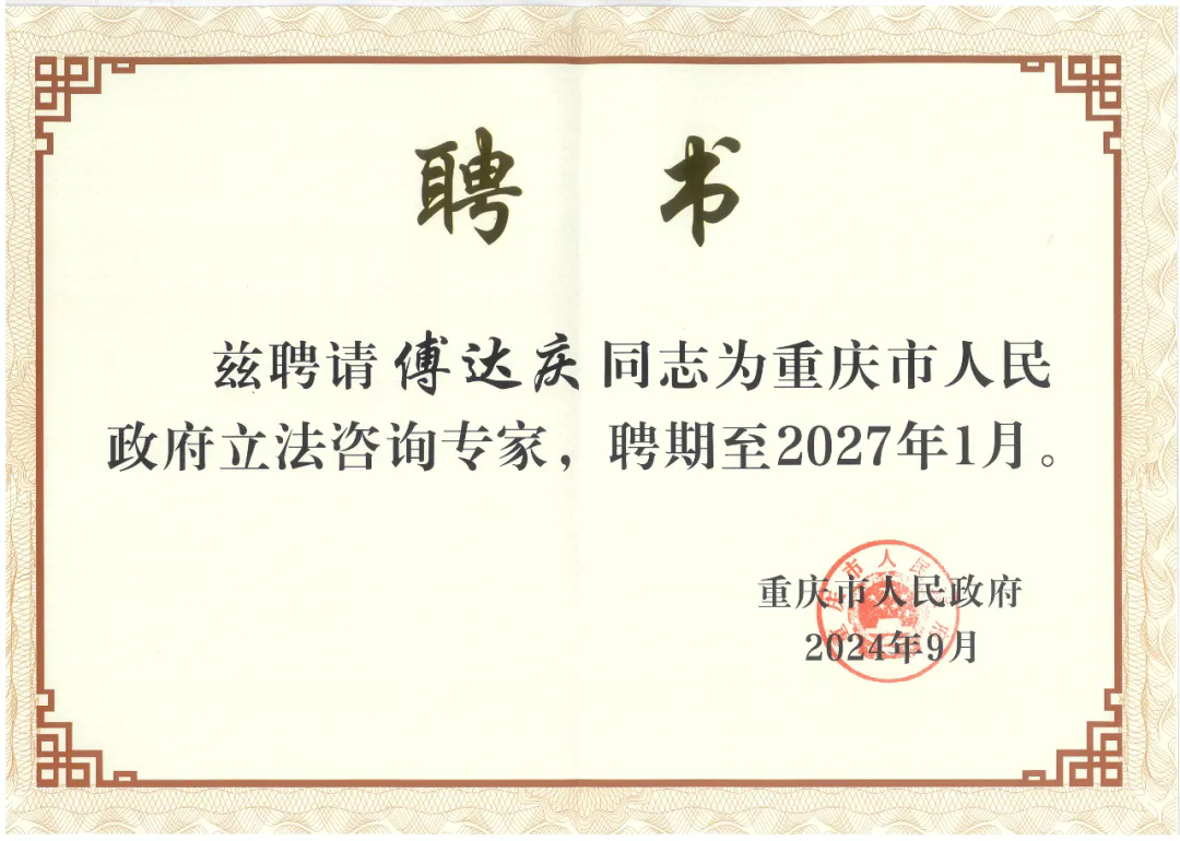 為提升依法行政水平、建設法治政府以及充分發揮專家智庫作用,助力提升政府立法質效,去年市政府在全市范圍內開展了市政府法律顧問和立法咨詢專家選聘活動。近日,重慶市人民政府辦公廳舉行了第六屆重慶市人民政府法律顧問和立法咨詢專家聘任儀式。根據《重慶市人民政府辦公廳關于聘任第六屆重慶市人民政府法律顧問和立法咨詢專家的通知》(渝府辦發【2024】71號),經市政府同意,傅達慶律師被聘為市政府立法咨詢專家。