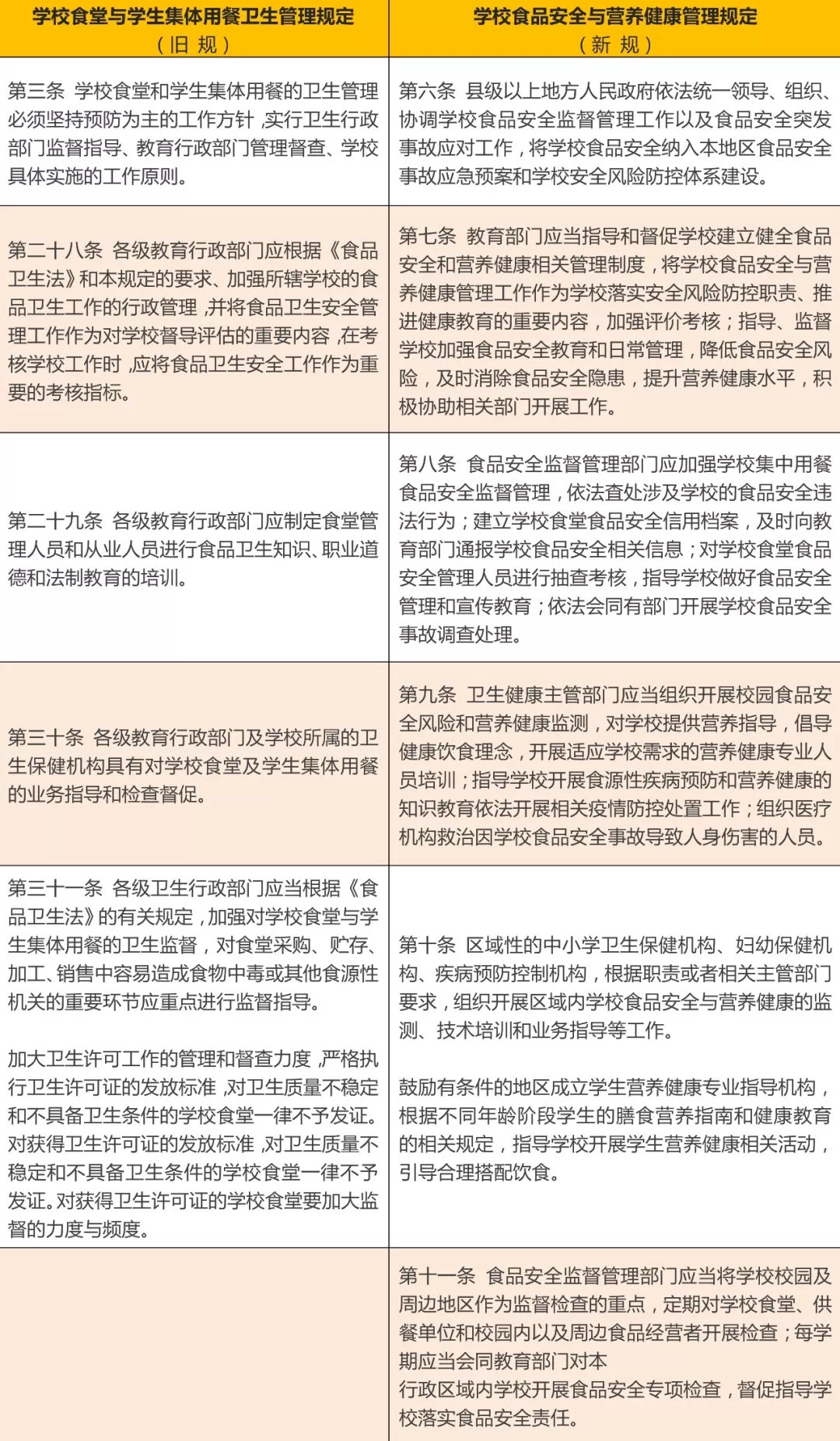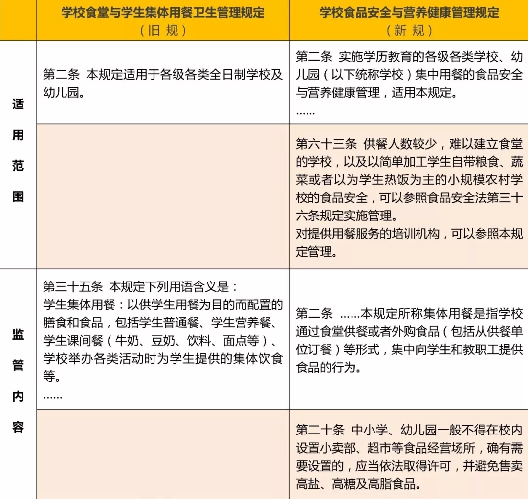 如上表所示,相比舊規,新規首先明確了新規適用的范圍是“實施學歷教育的各級各類學校、幼兒園(以下統稱學校)集中用餐的食品安全與營養健康管理”,相比于舊規的“各級各類全日制學校以及幼兒園”而言,更加明確了新規適用于所有的實施學歷教育的學校和幼兒園,無論是全日制或非全日制。