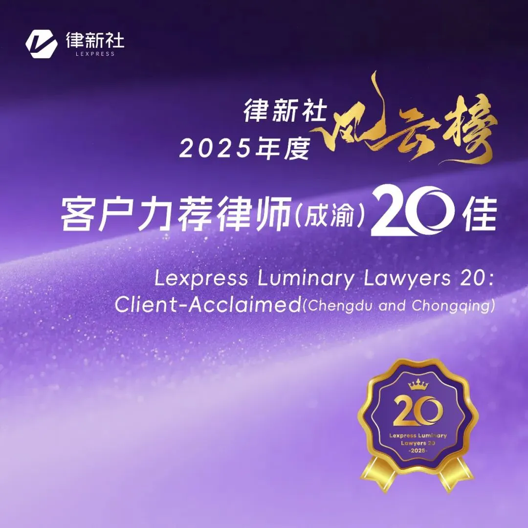 2026年1月30日,“律新社2025年度風云榜:客戶力薦律師(成渝)20佳”正式發布,成都辦公室合伙人李玥斌律師憑借卓越的專業實力與良好的客戶口碑成功入選。